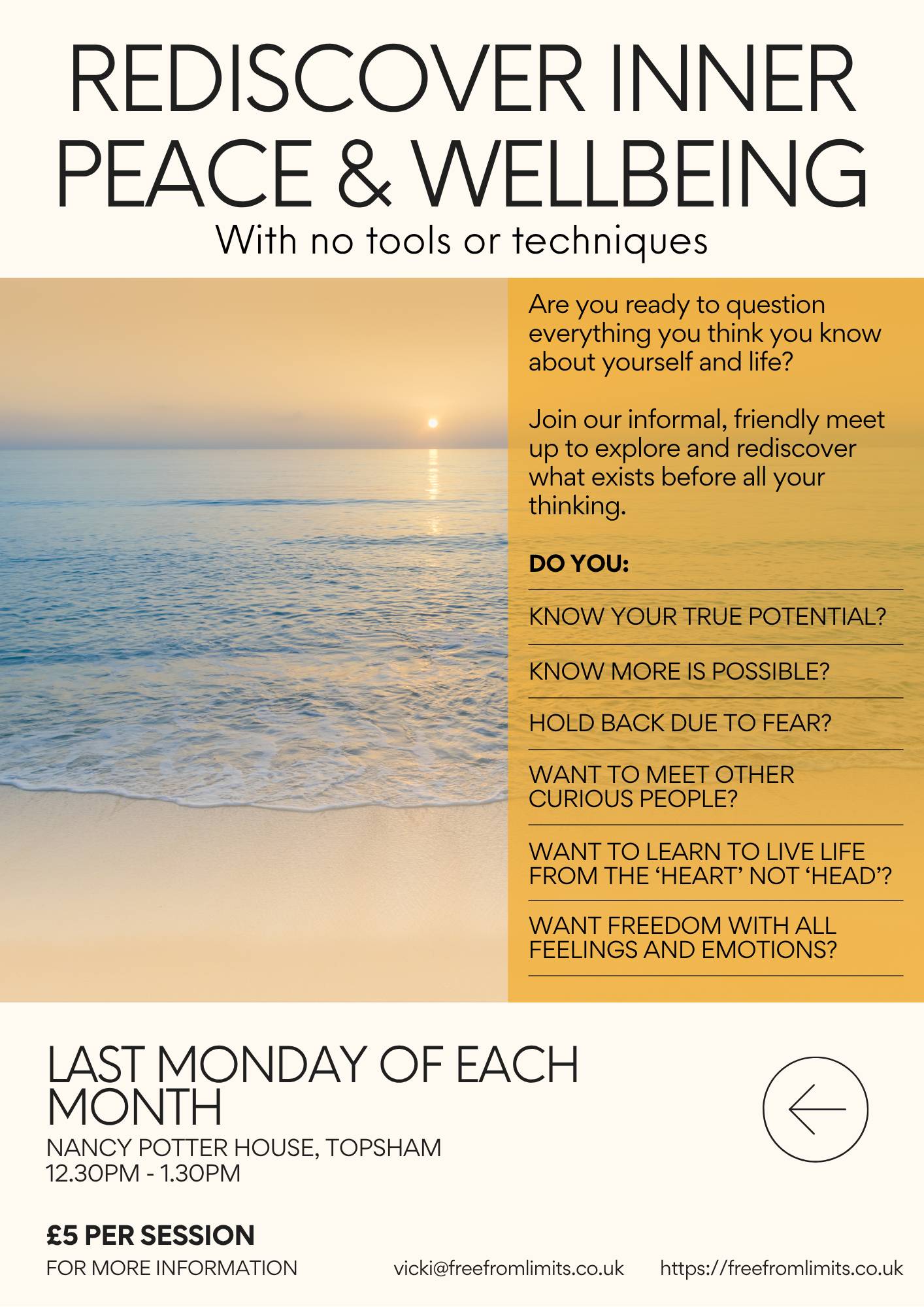 "Vicki’s Intuition Experiment is such a beautiful reminder that what we listen to truly matters. I love how she helps you become gently suspicious of that inner narrator -the voice of the ‘self’ that loops in fear or doubt, so there’s space for something new, softer, and truer to be heard. The journal’s daily prompts ‘What would I love or want right now? What would be loving and kind right now? What do I know right now?’ are such simple yet powerful ways to pause and tune into the voice of love. It’s amazing how much easier and lighter life feels when you do. This book really is an invitation to come home to yourself, and to start living from love rather than fear." Laura New Online Community - Intuition Experiment LiveI'm going to be running an online community to go alongside the launch of it, starting on 1st December. It's called the Intuition Experiment Live and will include an online WhatsApp group for accountability and idea sharing along with two online live calls with me to share results, seek support and ask questions. If you'd like to find out more you can do so by clicking here. When you join that, you'll get a copy of the book/journal included in the price. The Truth Beyond Thought - UpdateWhile I was in Spain, in one of the many inspiring conversations I had, I got the idea to have my book, The Truth Beyond Thought - Experiments To Rediscover Peace & Freedom, as a digital download (PDF) on my website. I know some of you don't like using Amazon or like to read books on your digital devices (I love my Remarkable for this because I can write on the PDF's and make notes) so you can now download it, and print it out if you so wish. It means I keep almost all of the sale price, rather than the majority going to Amazon! Monthly in person meet-upIf you live near Exeter then once a month I am running a meet-up in Topsham. You'll find details in the poster below: Calling All Over Thinkers!At Viva, I got chatting to a fellow coach and 'reformed over thinker', Craig Forster. We laughed about our ability to over think anything and everything and reflected briefly on how that had changed since coming across the Three Principles (that basis to what I share here). He threw out that he'd had an idea years ago to create 'Over Thinkers Anonymous' and we laughed about how we'd have 212 steps to recovery! But a spark was lit and this week we had a quick chat about progressing this idea in some form or other. And this is where we need your help... We'd like to create something that will be of use in the world and we'd therefore love your input as someone who over thinks. We will be holding a meeting on Wednesday 3rd December 12.30pm - 1.30pm for you to share your experiences. We hope this will be of benefit to you to feel less alone with your overthinking and may give you some insights on why you do it, whilst also giving us an idea of what would help you. Whatever we create as a result of the meeting, attendees will be given for free. If you'd be interested in helping to shape some useful resources for over thinkers (could be an online course, community, podcast, book...who knows...I'm not over thinking this!) then please let me know by replying to this email with a simple 'yes'. I'm going to sign off here. Wishing you a super weekend. Until next time, happy experimenting! Much love, Vicki Vicki Montague |